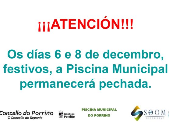 Os días 6 e 8 de decembro a piscina municipal permanecerá pechada. O domingo día 7 abriremos con normalidade.