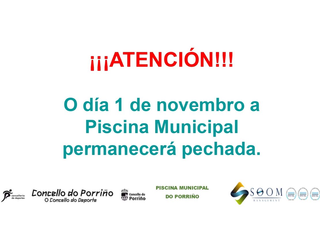 1 DE NOVEMBRO PISCINA PECHADA August 27, 2014 O día 1 de novembro, festivo, a piscina municipal permanecerá pechada.